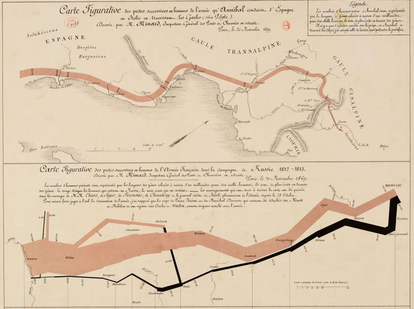 Bloggers such as Maggie Koerth-Baker at Boing Boing and Marcie Giovannoni at Complex Visuals have written about the recent jump in interest in infographics, which deliver often numerically-laden information in a way that helps, not hurts, understanding. Koerth-Baker also explores the history of this communication art, including an illustration considered to be the best infographic ever created, the map by Charles Joseph Minard that illustrated the destruction of Napoleon Boneparte’s army in the Russian campaign of 1812.