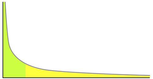 In this graph, the green-shaded area to the left represents things that are in high demand, and the yellow-shaded area to the right represents things that are in low demand. The volumes of the two areas are roughly equivalent. In a business context, the aggregate demand for the plentiful low-demand items is around the same as the aggregate demand for the scarce high-demand items.
