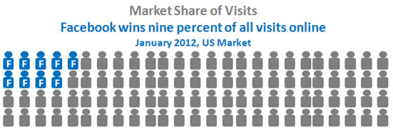 According to a report by Navneet Kaushal of PageTrafficBuzz, as of January 2012, Facebook by itself was the destination for nine percent of all online visits in the US, and twenty percent of all online page views.